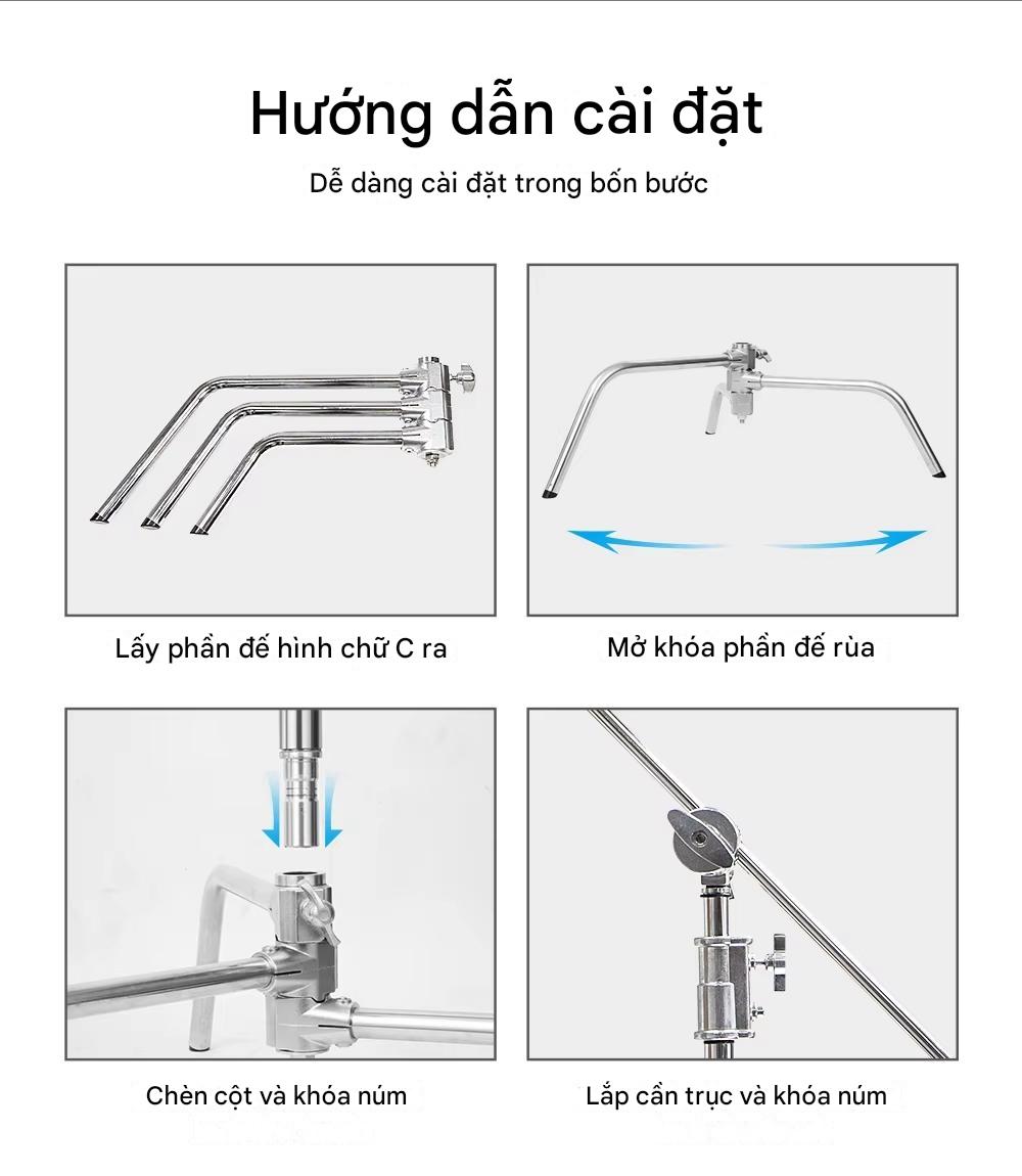 Chân đế chữ C này được sử dụng để gắn thiết bị chiếu sáng và nhiều loại dụng cụ và phụ kiện nhiếp ảnh khác.